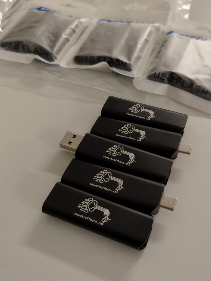 Equipped with branded "install-USB-sticks", we opened the doors for our first Linux Install Event. The sticks were prepared as bootable live USB for different distributions. Our demo-device served to test different desktop environments as well.